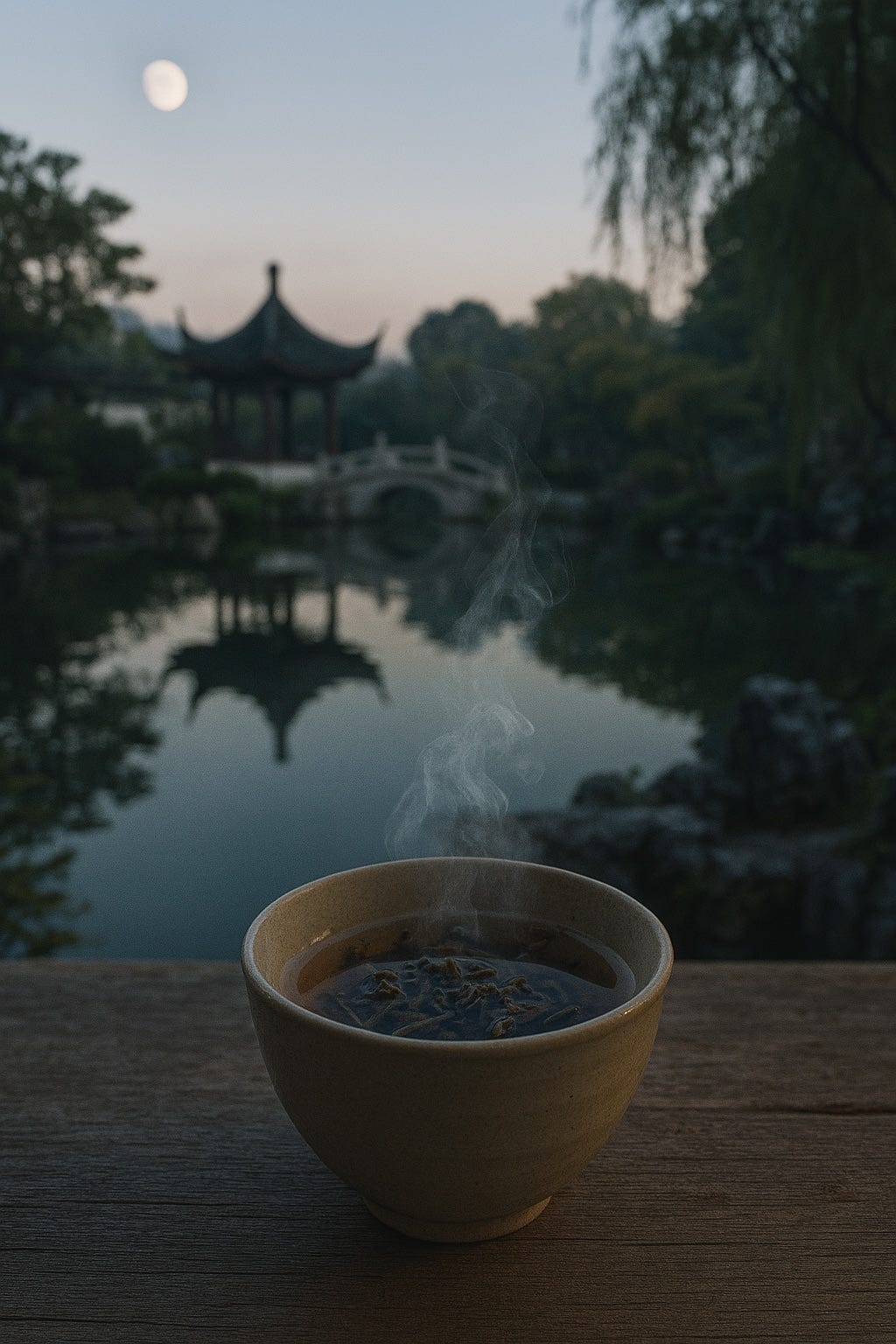 Your lowered gaze is now resting on the heated water’s surface. The tea leaves - dry, brittle -